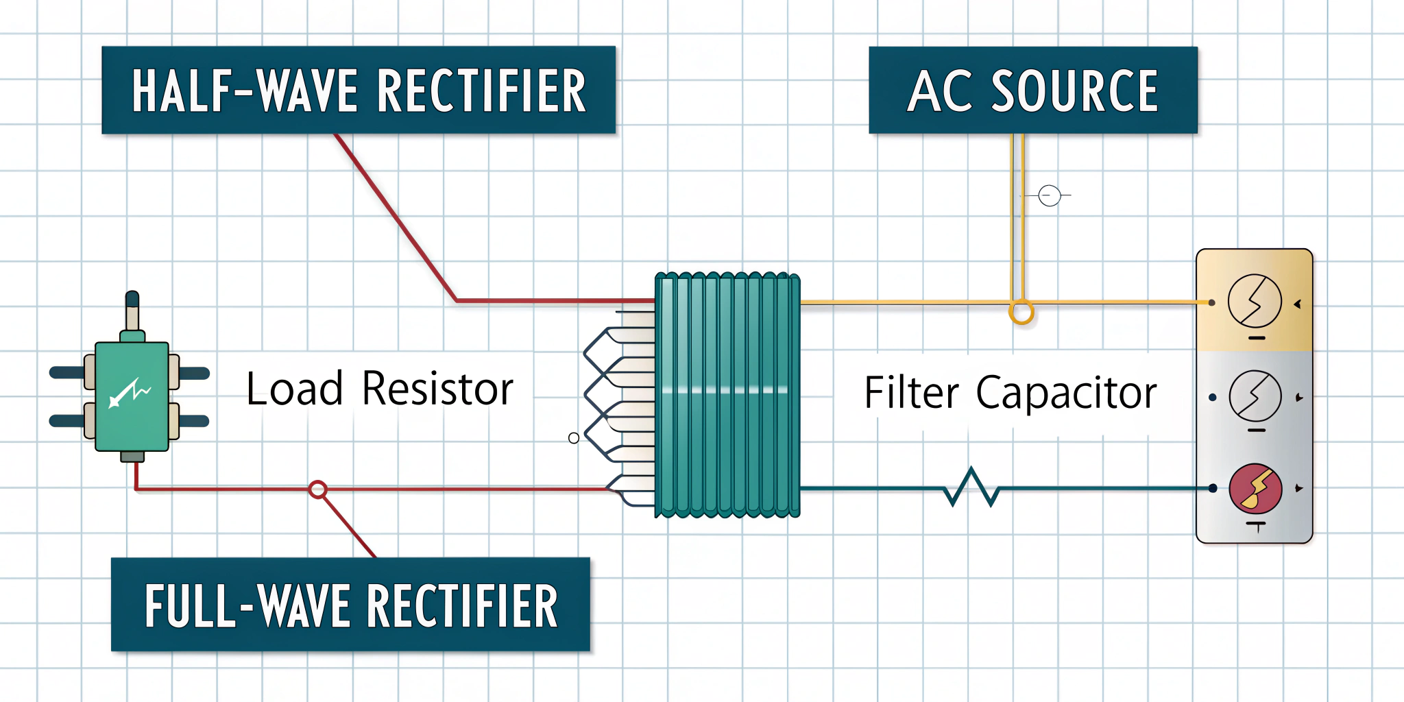 Half‑Wave Rectifier: A half‑wave rectifier converts AC into a pulsed DC output. It uses a single diode to pass one half of the input waveform. As a result, you get a series of positive (or negative) pulses instead of a smooth DC level. This simple circuit forms the basis of many power‑supply designs.
